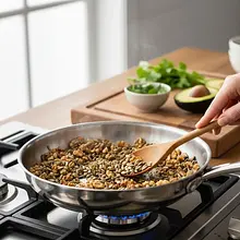 Rozgrzej małą, suchą patelnię na średniej mocy. Gdy będzie ciepła, wsyp na nią orzechy włoskie i nasiona słonecznika. Praż je przez 3-4 minuty, często mieszając drewnianą łyżką lub potrząsając patelnią. Uważaj, aby ich nie przypalić. Będą gotowe, gdy zaczną intensywnie pachnieć orzechami, a nasiona słonecznika nabiorą złotego koloru. Natychmiast przesyp je na zimny talerz, aby zatrzymać proces prażenia. Pozostaw do całkowitego ostygnięcia.
