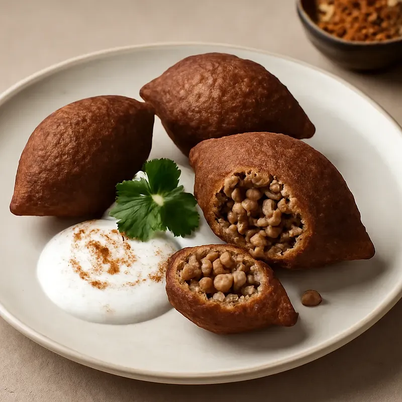 Legendarne libańskie kotleciki z jagnięciny i kaszy bulgur - chrupiące na zewnątrz, soczyste w środku. Mielona jagnięcina mieszana z bulgarem tworzy elastyczne ciasto, które formuje się w kształt torpedy z nadzieniem z mięsa i orzeszków piniowych. Smażone lub pieczone, podawane z jogurtem i sałatką. To danie wymaga wprawy, ale efekt jest oszałamiający.