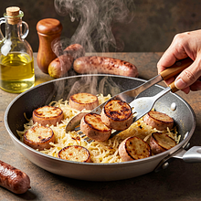 Klasyczne, domowe danie kuchni polskiej: kiełbasa podsmażona i krótko duszona z kapustą kiszoną, uzupełnione słodkością jabłka i delikatnością cebuli. To sycące, aromatyczne danie o wyraźnej kwasowości z kapusty i przyjemnej słono-słodkiej równowadze. Podawaj z młodymi ziemniakami lub razowym pieczywem; świetne na rodzinny obiad wiosną, gdy szukamy prostych, regionalnych smaków. Danie szybkie — gotowe w około 25 minut — i łatwe do wykonania nawet przez początkującego kucharza.