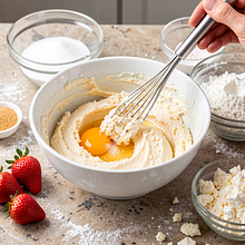 Do twarogu dodaj jajko(i), 30 g cukru oraz szczyptę soli. Rozbij jajka i wymieszaj składniki widelcem lub drewnianą łyżką tylko do połączenia. Następnie stopniowo dosypuj mąkę — najpierw 80 g, mieszaj delikatnie i sprawdzaj konsystencję. Ciasto powinno być miękkie, lekko klejące, ale dające się formować. Jeśli bardzo klei się do rąk, dosyp po 1 łyżce mąki aż uzyskasz gładką kulę.