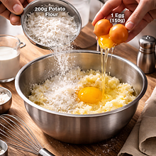 Dodaj do ciepłej masy 200 g mąki ziemniaczanej i 60 g jajka (jedno jajko). Najpierw odważ 150 g mąki ziemniaczanej i delikatnie wmieszaj widelcem w środku masy, aby zobaczyć, jak masa absorbuje mąkę. Następnie dodaj resztę mąki po łyżce, zagniatając ręką lub drewnianą łyżką, aż uzyskasz elastyczne, nieklejące ciasto. Jeśli masa jest zbyt sucha i krucha, dodaj łyżkę ciepłej wody; jeśli za bardzo klei się do rąk, podsyp odrobinę mąki ziemniaczanej.