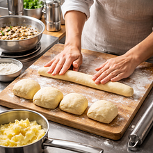 Formowanie klusek: podziel ciasto na 4 części, każdą część tocz wałek o grubości około 3 cm. Nożem odcinaj kawałki o wadze około 35–40 g (ważone: ok. 40 g każdy – dla porcji 4 osobowej dostaniesz ok. 20 klusek). Rękoma uformuj z każdego kawałka kulkę, a następnie palcem wskazującym zrób głębokie wgłębienie (kciukiem lub końcem drewnianej łyżki) – to miejsce, w którym będzie się zbierał sos.
