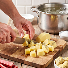 Umyj ziemniaki pod zimną wodą, obierz je i pokrój na równe kawałki (ok. 3–4 cm). Włóż do dużego garnka, zalej zimną wodą tak, by woda była 1–2 cm nad ziemniakami, dodaj 3 g soli. Doprowadź do wrzenia na dużym ogniu, potem zmniejsz ogień i gotuj 20–25 minut aż ziemniaki będą miękkie — sprawdź widelcem: widelec powinien wchodzić gładko, a ziemniak rozpadać się lekko.