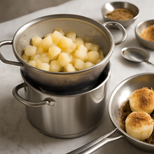 Wybierz 800 g mączystych ziemniaków. Obierz je ze skórki nożem do obierania. Pokrój na równe kawałki (ok. 3-4 cm) — to pozwoli równomiernie się ugotować. Włóż do dużego garnka, zalej zimną wodą (woda powinna je przykryć na ok. 2 cm) i dodaj 1 łyżeczkę soli (5 g). Doprowadź do wrzenia na dużym ogniu, zmniejsz ogień do średniego i gotuj 15-20 minut od momentu wrzenia, aż będą miękkie (sprawdź widelcem — widelec powinien wchodzić lekko i ziemniak rozpadać się przy naciśnięciu).