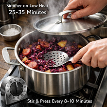 Przykryj garnek i gotuj na małym ogniu 25-35 minut. Co 8-10 minut zamieszaj, dociskając kapustę do dna, aby równomiernie się dusiła. Sprawdzaj ziemniaki po 20 minutach – powinny być miękkie, ale nie rozpadać się. Gdy ziemniaki są prawie miękkie, dodaj pokrojone, ugotowane buraki i resztę podsmażonych kawałków kiełbasy oraz boczku, aby podgrzały się przez 8-10 minut i oddały swój smak do potrawy.