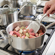 Podgrzewaj rabarbar na średnim ogniu przez 6–8 minut, mieszając co 1–2 minuty, aż kawałki zmiękną i puszczą sok, a płyn lekko zgęstnieje i stanie się błyszczący. Wyłącz ogień i odstaw do przestudzenia na 15 minut. Kompot powinien mieć miękkie kawałki rabarbaru, które łatwo rozgnieść łyżką.