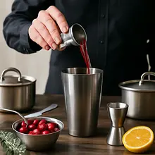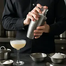 Zamknij szczelnie shaker i energicznie potrząsaj przez 10-15 sekund — aż zewnętrzna część shakera zrobi się bardzo zimna i pojawi się lekka para. Celem jest szybkie schłodzenie i delikatne rozcieńczenie koktajlu.