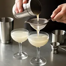 Otwórz shaker i przy użyciu sitka barowego (lub drobnego sitka) przelej koktajl do schłodzonych kieliszków. Przelewaj powoli, aby zachować klarowność i oddzielić lód od napoju. Jeśli chcesz, możesz przelać koktajl przez podwójne sito dla maksymalnej czystości.