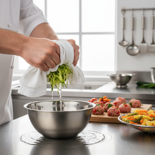 Przełóż startą cukinię na gęste sito lub złóż w czystą ściereczkę kuchenną i bardzo dokładnie odciśnij z niej nadmiar wody. To bardzo ważny krok! Jeśli go pominiesz, masa na klopsiki będzie zbyt rzadka i mogą się one rozpadać podczas gotowania. Jedną cebulę (75g) i jeden ząbek czosnku (5g) obierz i zetrzyj na tarce o drobnych oczkach lub bardzo drobno posiekaj.