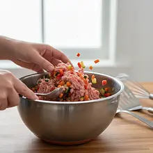 Dokładnie wymieszaj masę. Używając czystych dłoni, delikatnie, ale dokładnie wymieszaj wszystkie składniki w misce, aż do uzyskania jednolitej masy. Nie wyrabiaj jej zbyt długo i intensywnie – wystarczy, że składniki się połączą. Zbyt długie mieszanie może sprawić, że klopsiki będą twarde i zbite.