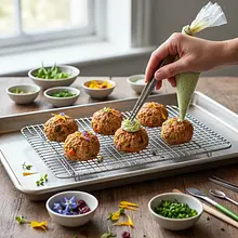 Podawaj potworki na 'trawie' z zielonego puree (np. z groszku lub brokułów) lub na 'wulkanie' z kaszy kuskus z sosem pomidorowym wypływającym ze środka. Możesz też nabić je na patyczki do szaszłyków, tworząc 'potworne' szaszłyki z dodatkiem pomidorków koktajlowych i kulek mozzarelli.