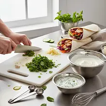 Teraz najważniejszy moment – zwijanie. Najpierw zagnij dolną krawędź tortilli do góry, przykrywając nią część nadzienia. Następnie, przytrzymując dolną zakładkę, zagnij do środka lewy i prawy bok tortilli. Na koniec, zaczynając od dołu, zwiń wrapa ciasno w rulon, upewniając się, że boczne zakładki pozostają w środku. Dzięki temu nadzienie nie wypadnie od dołu.