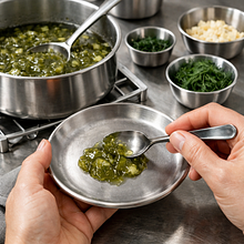 Gdy konsystencja jest zadowalająca, zdejmij garnek z ognia i natychmiast wmieszaj drobno posiekany koperek — dodanie koperku po gotowaniu zachowa jaśniejszy, świeży aromat. Spróbuj i ewentualnie dopraw minimalnie solą lub pieprzem (opcjonalnie).