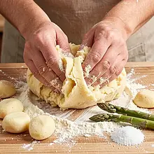 Zgnieć gorące ziemniaki tłuczkiem do puree lub przepuść przez praskę do ziemniaków do dużej miski. Ważne: masa powinna być gładka i nie mieć grudek. Odczekaj 5-10 minut, aż masa będzie ciepła, ale nie gorąca (dzięki temu mąka nie ściemnieje za mocno).