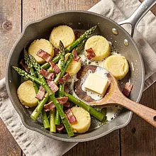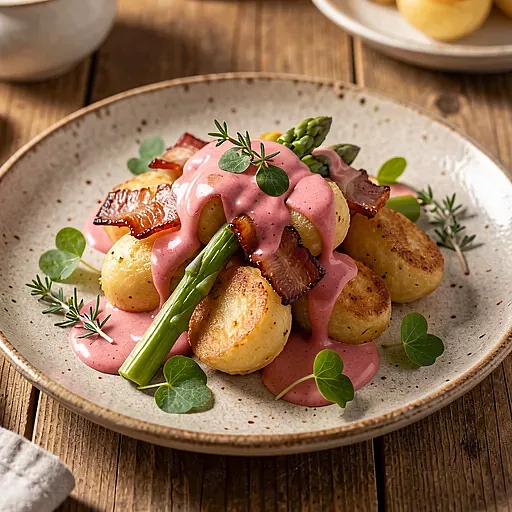 Przygotowanie ziemniaków: umyj ziemniaki i włóż do dużego garnka. Zalej zimną wodą tak, aby woda sięgała 2 cm powyżej ziemniaków. Dodaj 5 g soli (z podanych). Doprowadź do wrzenia na średnim ogniu, zmniejsz ogień i gotuj 25-30 minut aż ziemniaki będą miękkie — sprawdzisz to przebijając je nożem: nóż powinien wchodzić łatwo, bez oporu. Odcedź i odstaw do lekkiego przestygnięcia (ok. 10 minut), żeby nie parzyły przy obieraniu.