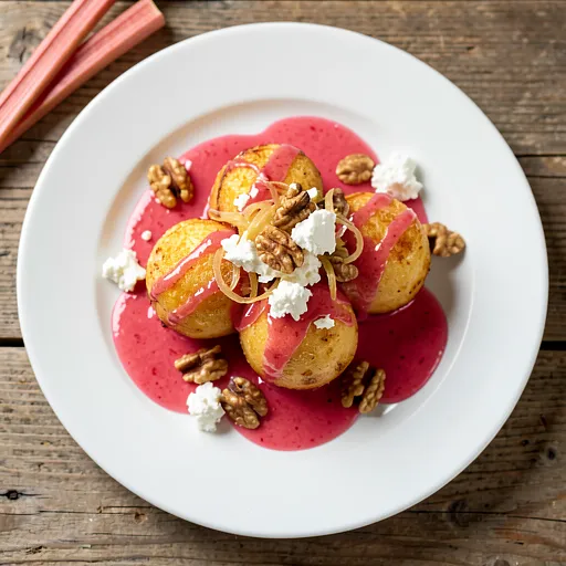 Nowoczesna odsłona klasycznych polskich kopytek: miękkie kluski ziemniaczane podane z kwaśno-słodkim sosem z rabarbaru, kremowym twarogiem i podsmażoną cebulką dla kontrastu tekstur. Danie łączy prostotę kuchni domowej z wiosennym, wyrazistym akcentem sezonowego rabarbaru. Idealne jako sycące danie główne na rodzinny obiad lub lekka kolacja; smakuje znakomicie z młodą sałatą z winegretem albo z dodatkiem wędzonego boczku dla amatorów intensywniejszych smaków. Wyrazista barwa rabarbaru dodaje talerzowi świeżości i wizualnego charakteru.