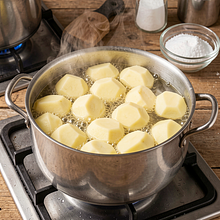 Użyj dużego garnka z przykrywką. Nie sol nigdy na samym początku (można lekko posolić wodę) — dodaj sól po spróbowaniu. Gotuj na wolnym wrzeniu, szybko gotujące się ziemniaki będą się rozpadać.