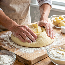Użyj praski do ziemniaków dla najgładszej struktury. Jeśli nie masz praski, przecieraj przez sito. Gdy ciasto jest zbyt lepkie, dodaj łyżkę mąki na raz. Jeśli zbyt suche — delikatnie zwilż rękę wodą.