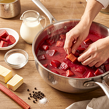 Użyj szerokiego rondla, by rabarbar równomiernie się zredukował. Jeśli sos jest zbyt rzadki, gotuj bez pokrywki do odparowania nadmiaru płynu. Nie gotuj śmietany długo po dodaniu, bo może się zwarzyć.