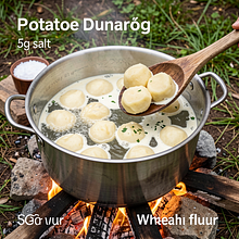 Użyj dużego garnka z grubym dnem lub żeliwnego kociołka na ognisko. Sprawdź miękkość widelcem — gdy ziemniak rozpada się przy lekkim dociśnięciu, jest gotowy.