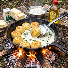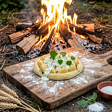 Tradycyjne kopytka przygotowane na ognisku, wzbogacone kremowym twarogiem i świeżym szczawiem — wiosenny twist na polskim klasyku. Kopytka powstają z tłuczonych, odsączonych ziemniaków i mąki, formowanych w wałeczki i gotowanych w wodzie rozgrzanej nad ogniem; następnie można je krótko podsmażyć na żeliwnej patelni nad żarem, aby uzyskać złotą skorupkę. Sos tworzy delikatny twaróg zmieszany ze śmietaną, podsmażoną cebulą i posiekanym szczawiem, co daje świeży, lekko kwaśny kontrapunkt do mięsistej konsystencji kopytek. Danie komponuje się świetnie z wędzonym boczkiem jako dodatek (opcjonalnie) lub z natką pietruszki dla świeżości. To sycące, rustykalne danie idealne na majówkę, biwak lub rodzinny obiad na świeżym powietrzu — aromatyczne, wizualnie apetyczne (zrumienione kopytka i zielony sos) i łatwe do przeniesienia na kuchnię polową.