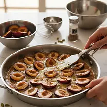 Na warstwie gorącego karmelu zacznij układać połówki śliwek, przecięciem do dołu. Układaj je bardzo ciasno, jedna obok drugiej, zaczynając od zewnętrznej krawędzi formy i kierując się do środka, tworząc wzór przypominający spiralę lub kwiat. Śliwki lekko skurczą się podczas pieczenia, więc nie zostawiaj między nimi wolnych przestrzeni. Jeśli używasz orzechów, posyp je teraz równomiernie na ułożonych śliwkach.
