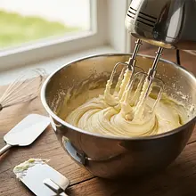 Zmniejsz obroty miksera do średnich. Dodawaj jajka (w temperaturze pokojowej) pojedynczo, jedno po drugim. Każdą porcję jajka miksuj tylko do momentu, aż połączy się z masą maślaną. Zeskrobuj masę ze ścianek miski szpatułką po dodaniu każdego jajka. Na koniec dodaj 5g ekstraktu waniliowego i krótko zmiksuj.