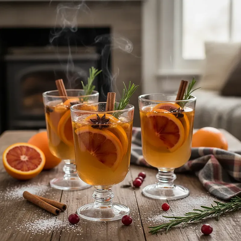 Podawaj grzaniec w przezroczystych, żaroodpornych kubkach lub szklankach, aby pięknie wyeksponować jego złoty kolor oraz pływające w nim przyprawy i owoce. Każdą porcję udekoruj świeżą gałązką rozmarynu i opcjonalnie cienkim plasterkiem pomarańczy. Dla dorosłych, do każdej porcji można dodać 25-30 ml ciemnego rumu, brandy lub likieru pomarańczowego, aby stworzyć wersję alkoholową. Należy to zrobić bezpośrednio przed podaniem, już w kubku.