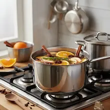 Postaw garnek na kuchence na średniej mocy palnika. Podgrzewaj napój powoli, przez około 20 minut, aż stanie się bardzo gorący i aromatyczny. Kluczowe jest, aby NIE DOPROWADZIĆ go do wrzenia. Gotowanie zniszczyłoby delikatne aromaty przypraw i witaminy. Grzaniec jest gotowy, gdy po całej kuchni roznosi się intensywny, korzenny zapach, a z powierzchni napoju unosi się para.