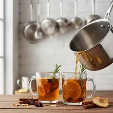 Przelej gorący napój do kubków lub szklanek z grubego szkła, odpornego na wysoką temperaturę. Możesz go przelać przez sitko o drobnych oczkach, aby był idealnie klarowny, lub serwować bezpośrednio z garnka wraz z przyprawami dla bardziej rustykalnego wyglądu. Każdą porcję udekoruj świeżą gałązką rozmarynu. Dodatkowo, dla koloru i smaku, możesz wrzucić do każdego kubka kilka kulek świeżej żurawiny. Podawaj natychmiast, póki jest gorący.