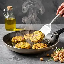 Fit i wiosenna przekąska inspirowana kuchnią roślinną: złociste kotleciki z ciecierzycy podane z lekko kwaśno-słodkim chutney z rabarbaru oraz świeżą sałatką z kiełków i szczawiu. Danie łączy kremową strukturę ciecierzycy, orzechowy akcent płatków owsianych i świeżość szczawiu, a chutney dodaje charakterystycznej wiosennej kwasowości. Idealne jako przystawka na Sylwestra w wersji fit, na spotkanie ze znajomymi lub jako lekki obiad. Podawać gorące kotleciki z łyżką chutney i porcją sałatki; wizualnie kontrast kolorów (różowy rabarbar, zielone kiełki, złote kotleciki) przyciąga wzrok i zachęca do degustacji.