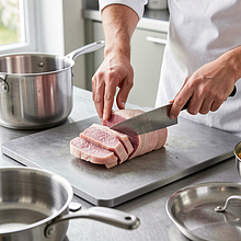 Podziel schab na 4 równe plastry po około 200 g każdy. Jeśli plaster jest grubszy, przetnij go poziomo na pół. Ułóż plaster pomiędzy dwoma arkuszami folii spożywczej lub w plastikowej torbie i rozbij mięso tłuczkiem do mięsa na grubość 4–6 mm. Uderzaj równomiernie, zaczynając od środka ku brzegom — nie rozrywaj mięsa.