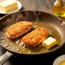 Delikatnie włóż kotlety na rozgrzany olej. Smaż bez przesuwania przez 3–4 minuty aż spód będzie złocisty i chrupiący. Obróć kotlet za pomocą szczypiec lub szerokiej łopatki i smaż drugą stronę kolejne 3–4 minuty. Pod koniec smażenia dodaj 20 g masła na patelnię i przechylając patelnię polewaj nim kotlety 1–2 razy, aby nabrały ładnej barwy i aromatu.