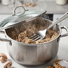 Odważ 200 g kaszy gryczanej. Wsyp kaszę do sitka i dokładnie opłucz pod zimną, bieżącą wodą przez około 30 sekund, potrząsając sitkiem, aż woda będzie czyściutka. W garnku o pojemności 1,5–2 l zagotuj 400 ml wody (stosunek 1:2). Dodaj 5 g soli do wrzątku. Wsyp opłukaną kaszę, zamieszaj jedną łyżką, zagotuj ponownie na dużym ogniu, a następnie zmniejsz ogień do najmniejszego i przykryj pokrywką. Gotuj 12–15 minut bez podnoszenia pokrywki — kasza jest gotowa, gdy wchłonęła całą wodę, ziarna są miękkie, ale nie rozgotowane i oddzielają się od siebie. Zdejmij z ognia, zostaw pod przykryciem jeszcze 5 minut, a potem rozluźnij widelcem, aby ziarna się 'nadmuchnęły'.