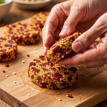 Delikatne kotlety z kaszy jaglanej i pieczonych buraczków to wiosenna, kolorowa propozycja kuchni wegetariańskiej. Połączenie lekko orzechowej kaszy jaglanej ze słodko-ziemistym burakiem daje kremową konsystencję wnętrza, a zewnętrzna, złocista skórka tworzy kontrast tekstur. Danie ma korzenie w polskiej prostocie (kasze i warzywa) z nowoczesnym twistem — dodatek świeżej natki i tymianku podbija aromat, a opcjonalne ser żółty lub kwaśna śmietana w roli dipu dodają kremowości. Kotlety świetnie sprawdzą się jako danie główne na obiad, lekka kolacja lub element bufetu przy spotkaniu ze znajomymi. Podawaj je z sałatką z młodych liści, kwaśną śmietaną lub jogurtem z koperkiem, a także z ziemniakami z wody lub w bułce jako wegetariański burger.