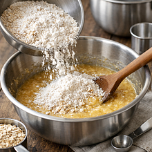 W drugiej dużej misce połącz płatki owsiane, mąkę pszenną, proszek do pieczenia, cynamon i sól. Przesiej mąkę i proszek do pieczenia, a następnie wymieszaj suchą mieszankę drewnianą łyżką, aby równomiernie rozprowadzić przyprawy.