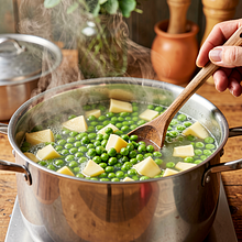 Do garnka dodaj pokrojony ziemniak i groszek zielony, zalej bulionem warzywnym tak, aby przykrył warzywa (ok. 1 litr). Doprowadź do wrzenia na dużym ogniu, następnie zmniejsz ogień do średnio-niskiego i gotuj 12-15 minut, aż ziemniak będzie miękki (sprawdź widelcem — powinien łatwo wchodzić). Jeśli używasz mrożonego groszku, gotuj 10-12 minut.