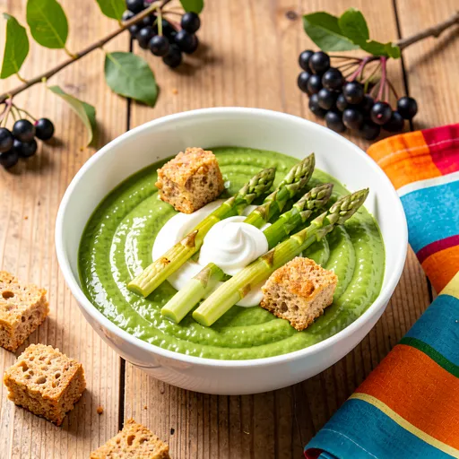 Podawaj zupę gorącą w jasnych miskach, dodaj łyżkę śmietany na środku i dekoruj podsmażonymi szparagami oraz grzankami dla kontrastu tekstur. Dla wersji bez nabiału pomiń śmietanę i dodaj odrobinę oliwy z oliwek przed podaniem.