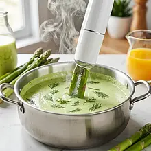 Wyłącz ogień. Za pomocą blendera ręcznego (immersion blender) lub blendera kielichowego zmiksuj zawartość garnka na gładki krem — blenduj przez 1–2 minuty, przesuwając blender po całej powierzchni, aż zupa będzie aksamitna i jednolita. Jeśli używasz blendera kielichowego, miksuj partiami i uważaj na parę.