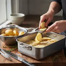 Wstaw przykryte naczynie do nagrzanego do 180°C piekarnika. Piecz przez 45 minut. Po tym czasie ziemniaki powinny być już prawie miękkie.