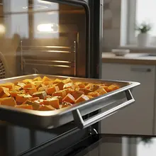 Wstaw blachę z warzywami do nagrzanego piekarnika. Piecz przez około 30-35 minut. W połowie pieczenia (po ok. 15 minutach) przemieszaj warzywa łopatką, aby równomiernie się zarumieniły. Warzywa są gotowe, gdy dynia i marchewka są miękkie (można to sprawdzić, nakłuwając je widelcem), a ich brzegi zaczynają się lekko karmelizować i przybierać złocisty kolor.