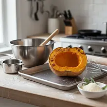Wyjmij upieczoną dynię z piekarnika i pozwól jej lekko przestygnąć przez około 5 minut. Następnie przełóż wszystkie kawałki do kielicha blendera stojącego lub wysokiego naczynia (jeśli używasz blendera ręcznego). Zblenduj dynię na idealnie gładką, aksamitną masę. Jeśli puree jest bardzo gęste, możesz dodać 1-2 łyżki gorącej wody, aby ułatwić blendowanie. Odstaw puree na bok.