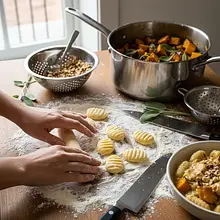 To danie to esencja jesieni zamknięta na talerzu. Aksamitne, rozpływające się w ustach domowe gnocchi ziemniaczane otulone są kremowym sosem na bazie słodkiej, pieczonej dyni Hokkaido i serka mascarpone. Całość dopełnia intensywny, ziołowy aromat chrupiącej szałwii smażonej na maśle oraz przyjemna chrupkość prażonych orzechów laskowych. Danie pochodzi z tradycji włoskiej, gdzie gnocchi są uwielbianą alternatywą dla makaronu. Podawane jako 'primo piatto' (pierwsze danie główne), idealnie sprawdzi się na elegancką kolację, rodzinny obiad w chłodny dzień lub gdy po prostu mamy ochotę na coś wyjątkowo pysznego i pocieszającego. Jego ciepła, pomarańczowa barwa i bogactwo tekstur sprawiają, że jest nie tylko ucztą dla podniebienia, ale i dla oczu. Podawaj je posypane świeżo startym Parmezanem, który podkreśli głębię smaku.