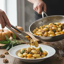 To danie to kwintesencja jesieni na talerzu. Aksamitne, delikatne gnocchi ziemniaczane otulone kremowym sosem na bazie pieczonej dyni hokkaido, której naturalna słodycz doskonale komponuje się z ziemistym aromatem świeżej szałwii. Każdy kęs to połączenie miękkich kluseczek, rozpływającej się w ustach dyni i chrupiących, podprażonych orzechów włoskich, które dodają potrawie głębi i tekstury. Całość dopełnia wyrazisty, słony smak parmezanu, który idealnie balansuje słodycz dania. Wizualnie potrawa zachwyca ciepłą, pomarańczową barwą, przełamaną zielenią listków szałwii. Jest to danie niezwykle sycące i rozgrzewające, idealne na chłodniejsze dni. Można je podawać jako wykwintne danie główne na specjalne okazje, ale jest na tyle proste w przygotowaniu, że sprawdzi się również jako pomysł na wyjątkowy, codzienny obiad.