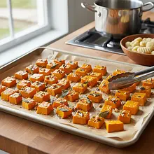 Wyłóż dużą blachę do pieczenia papierem. Rozłóż na niej kawałki dyni w jednej warstwie, unikając ich nakładania się na siebie. Wstaw blachę do nagrzanego piekarnika i piecz przez około 25-30 minut. Dynia jest gotowa, gdy widelec wchodzi w nią z łatwością, a jej krawędzie są lekko zrumienione i skarmelizowane. Upieczona dynia będzie miała intensywniejszy, słodszy smak.