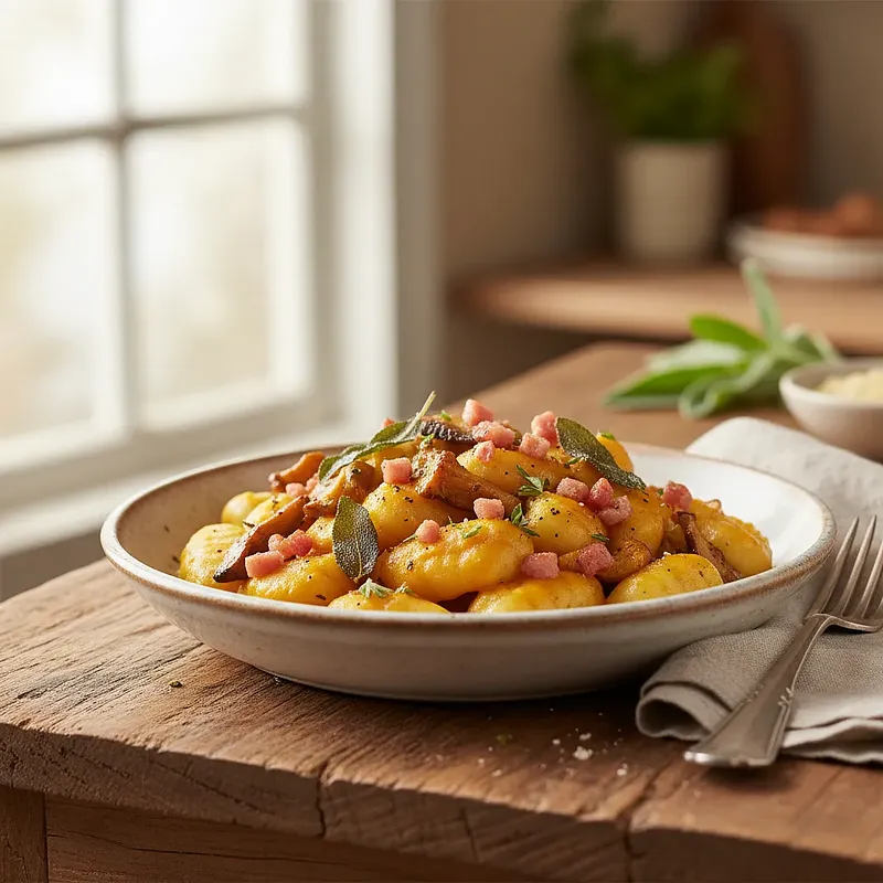 To danie to kwintesencja jesieni zamknięta na talerzu. Delikatne, rozpływające się w ustach kluseczki gnocchi, przygotowane od podstaw z mączystych ziemniaków, otulone są aksamitnym, głębokim w smaku sosem z pieczonej dyni Hokkaido i aromatycznej szałwii. Całość wzbogacona jest o ziemiste nuty leśnych grzybów, słoną chrupkość wytopionej pancetty oraz intensywność parmezanu. Danie jest nie tylko niezwykle smaczne, ale również pięknie prezentuje się na talerzu dzięki intensywnemu, pomarańczowemu kolorowi sosu. Idealne na chłodne wieczory, elegancką kolację czy po prostu, gdy mamy ochotę na coś wyjątkowego i pocieszającego. To włoska klasyka w sezonowej, bogatej odsłonie, która z pewnością zachwyci każdego smakosza.