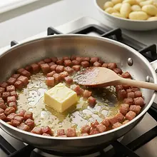 Odcedzone, gorące gnocchi przełóż bezpośrednio z garnka na patelnię z masłem szałwiowym. Delikatnie wymieszaj, aby każda kluseczka pokryła się sosem. Możesz je podsmażyć przez minutę, aby lekko się zrumieniły. Dodaj upieczoną dynię i połowę chrupiącej pancetty. Ponownie delikatnie wymieszaj, aby nie rozgnieść dyni.