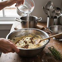 Gdy jajka połączą się z częścią mąki, tworząc gęstą pastę, zacznij powoli dolewać wodę, cały czas mieszając widelcem lub trzepaczką. Mieszaj energicznie, rozbijając wszystkie grudki, aż do uzyskania jednolitego, gładkiego ciasta. Konsystencja powinna być gęstsza niż na naleśniki, ale rzadsza niż na pierogi - powinna swobodnie, ale leniwie spływać z łyżki. Odstaw ciasto na 10 minut, aby 'odpoczęło'.