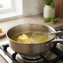 W małym rondelku o jasnym dnie umieść masło i podgrzewaj na średnim ogniu. Masło najpierw się rozpuści, potem zacznie się pienić i 'strzelać' - to odparowuje z niego woda. Po chwili piana opadnie, a na dnie zaczną pojawiać się brązowe drobinki (to cząstki stałe mleka). Mieszaj rondelkiem, aby masło równomiernie się podgrzewało. Gdy drobinki staną się jasnobrązowe, a masło nabierze bursztynowego koloru i zacznie intensywnie pachnieć orzechami, natychmiast zdejmij je z ognia, aby go nie spalić.