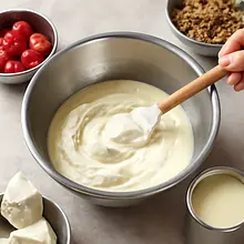 Delikatnie wmieszaj ubita śmietankę do masy mascarpone-kondensat: dodaj 1/3 ubitej śmietanki do masy i energicznie wymieszaj, aby ją rozluźnić. Następnie dodaj kolejne 1/3 i delikatnie złoż (fold) z dołu miski do góry, używając szerokiej szpatułki, aż nie będzie widocznych dużych smug. Na końcu dodaj ostatnią część i delikatnie połącz do jednolitego, kremowego koloru. Masa powinna być gęsta, ale puszysta i jednolita.